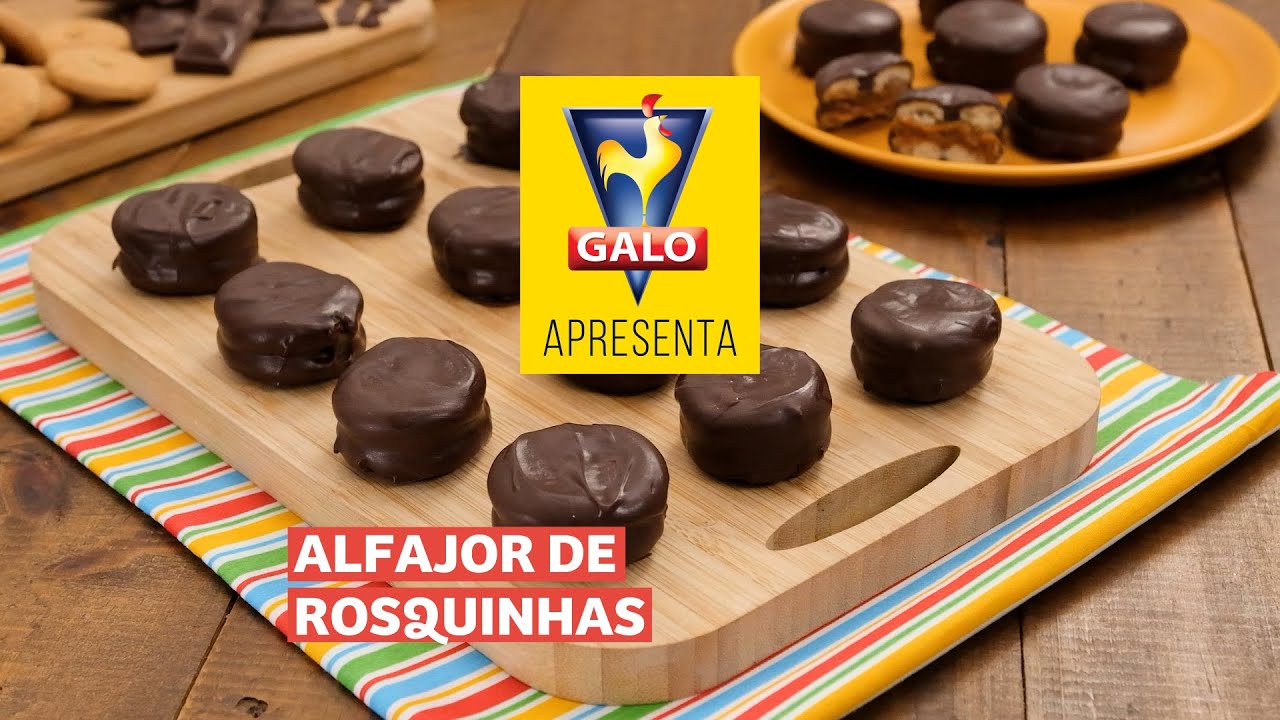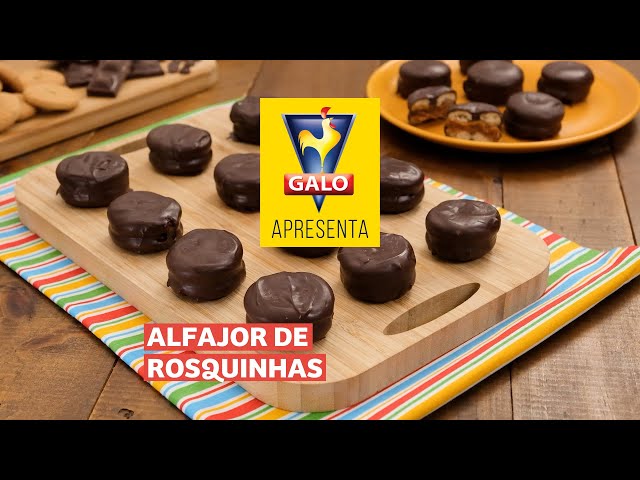 Receita de alfajor com massa à base de Rosquinhas GALO sabor Leite, recheado com doce de leite e cobertura de chocolate.