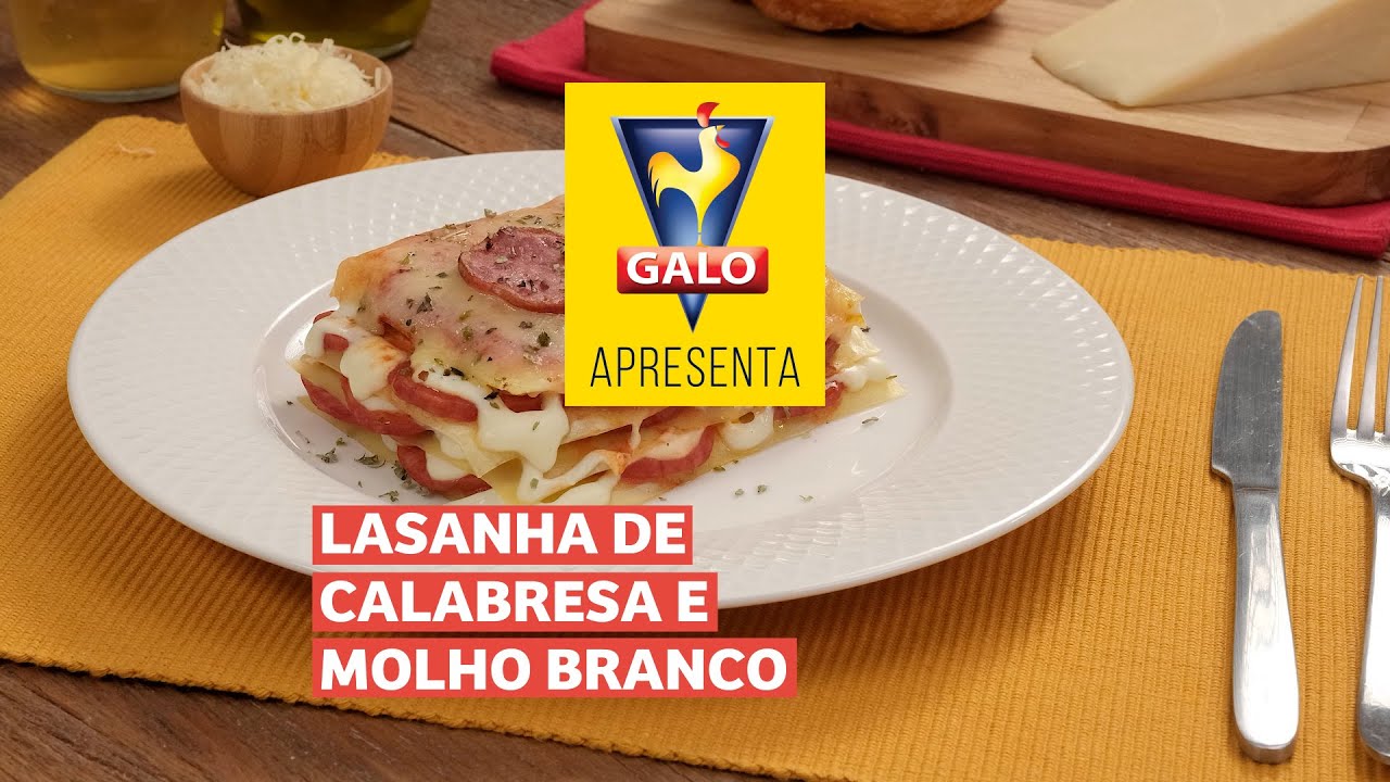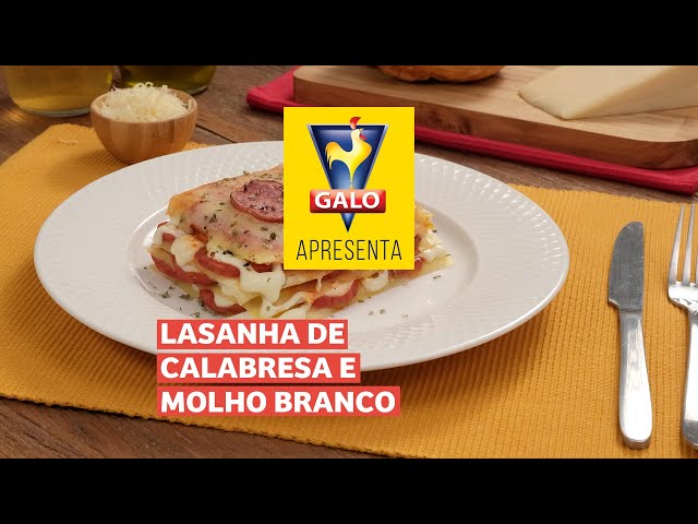 Lasanha preparada com Massa para Lasanha Galo e recheada com molho branco preparado com farinha de trigo e leite. A calabresa também faz parte do molho.