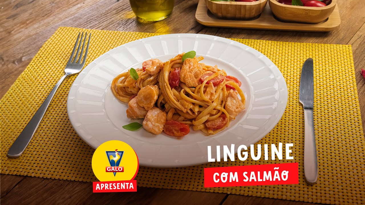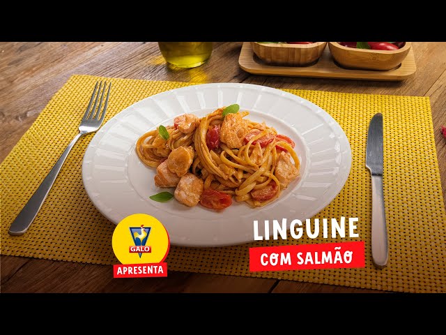 Linguine GALO Sêmola envolto em cubos suculentos de salmão, tomates-cereja e um cremoso molho de tomate com creme de leite.