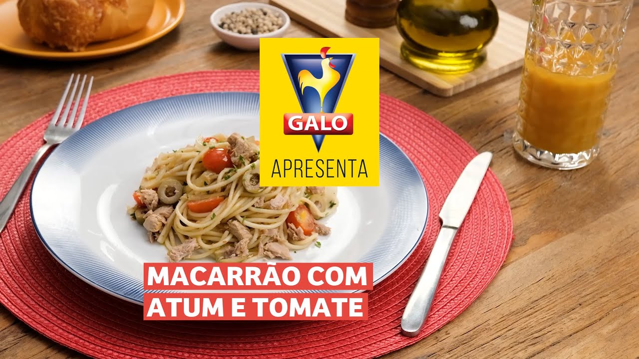 Macarrão GALO tipo Espaguete com atum preparado com tomates e azeitonas.