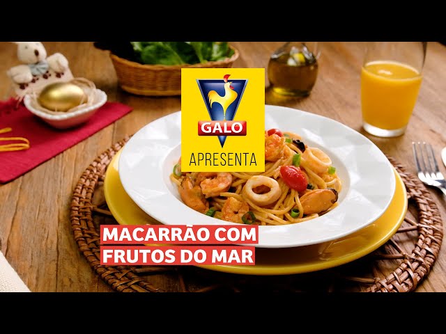 Macarrão Espaguete Sêmola Galo preparado com lula, mexilhões e camarão.