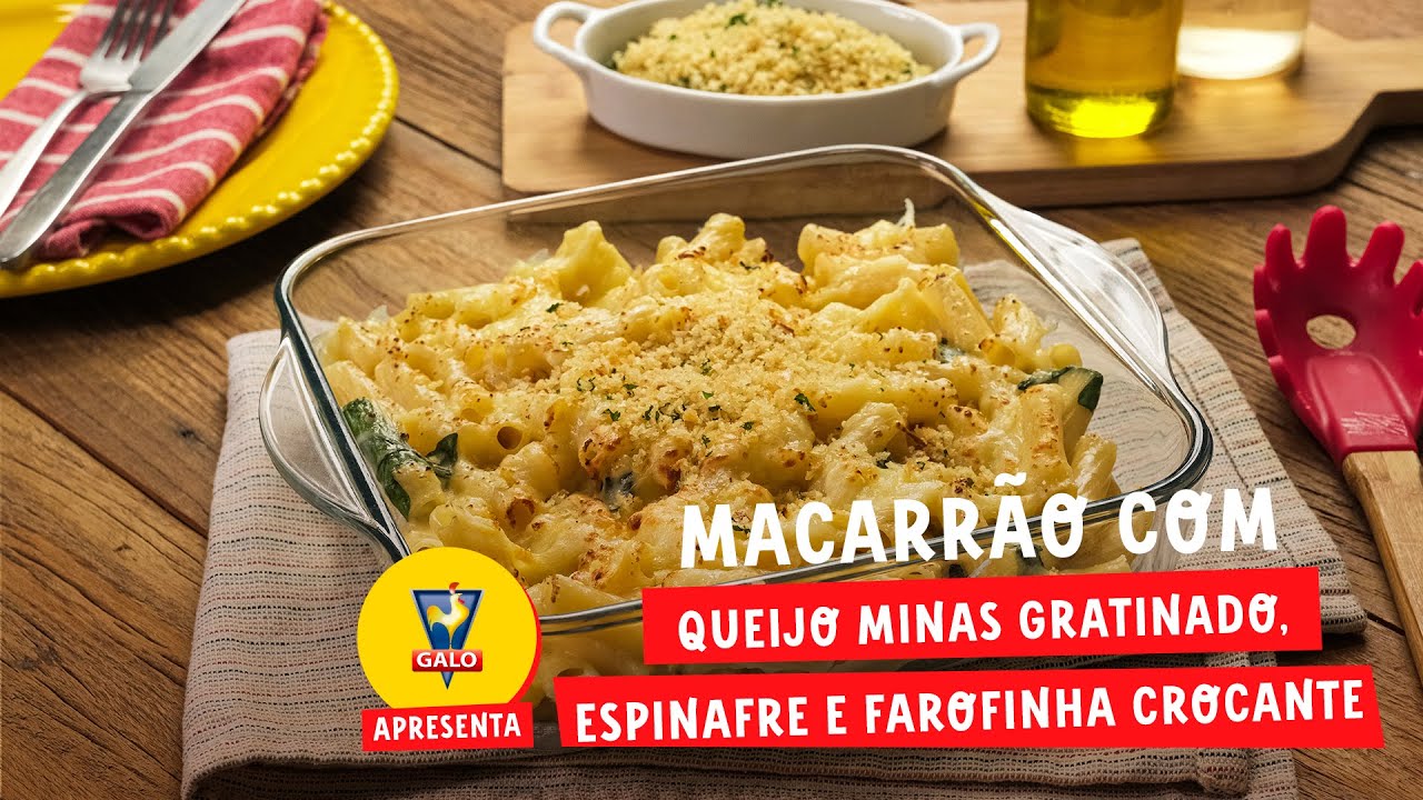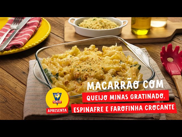 Macarrão com Queijo Minas Gratinado, Espinafre e Farofinha Crocante