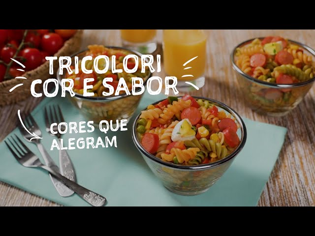 Em uma panela grande, coloque 1 L de água para cada 100 g de Macarrão Galo Tricolori e cozinhe conforme as instruções da embalagem. Escorra, resfrie em água gelada e envolva em fios de azeite.
