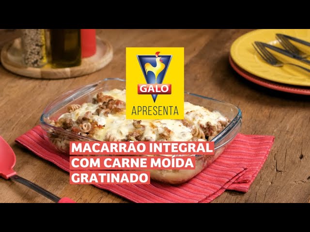 Macarrão Galo Parafuso Integral com carne moída, tomate e azeitonas. Gratinado ao forno com queijo muçarela ralado.