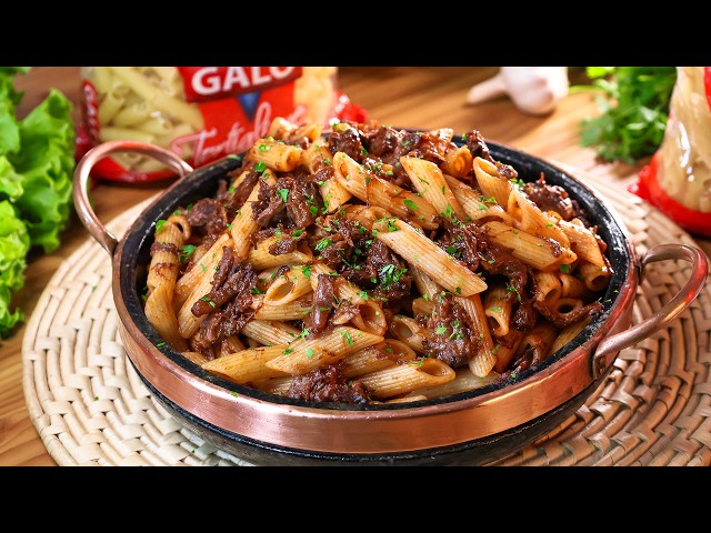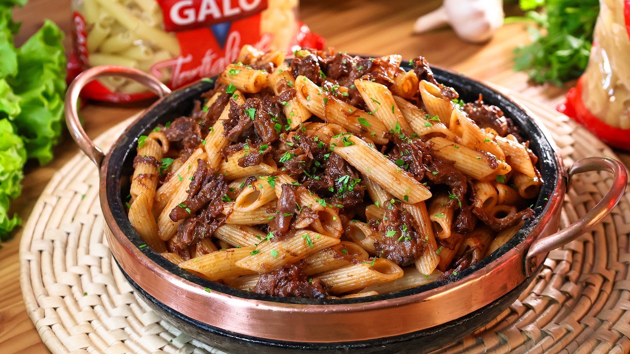 Macarrão Pena Galo com rabada desmanchada em molho de vinho reduzido: sabor intenso e encorpado, finalizado com queijo e cheiro‑verde.